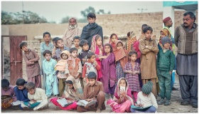 A diverse group of children and adults engaged in outdoor education in Pakistan.