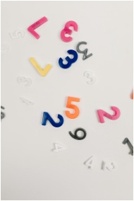 Brightly colored plastic numbers scattered on a wh