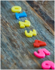 Bright plastic numbers arranged on rustic wood bac