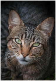 Intense gaze of a tabby cat captured in a close-up portrait.