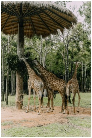 Three giraffes feeding under a thatched roof surrounded by lush greenery in a safari setting.