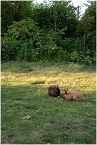 Two rabbits relaxing and grazing in a lush green meadow under sunlight.