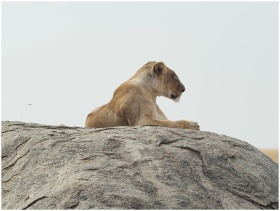 Serene lioness resting on a large rock, capturing the essence of wildlife safari.