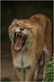 Close-up of a yawning lioness showing her powerful