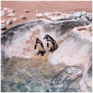 Two Humboldt penguins resting by a rocky pool in Callao Zoo, Peru.