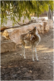 A young fawn with antlers reaching for tree leaves in a sunlit rocky area.