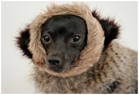Close-up portrait of an adorable black dog wearing a fur coat, capturing a cute and funny expression.