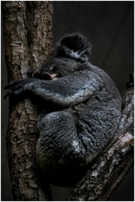 A peaceful koala sleeping on a tree branch, showcasing its natural habitat and behavior.