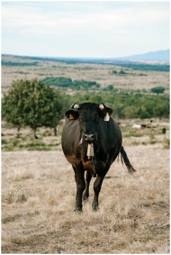 A black cow stands in a dry, grassy field in Spain, capturing the essence of rural life.