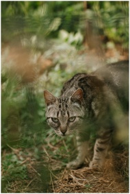 Close-up of a wild tabby cat in lush greenery, displaying natural animal behavior.