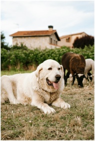 White guard dog resting with sheep in rural Spain,
