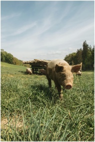 A pig wandering freely on a lush green pasture in