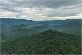 A scenic landscape of lush green mountains and mis