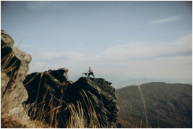 A couple gracefully dances on a rocky mountain peak under a clear sky, capturing a moment of freedom.