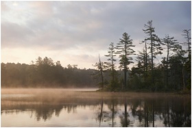 Serene misty forest and lake view reflecting trees in New York, USA.