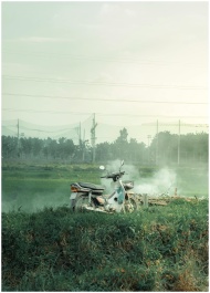 A vintage motor scooter parked in a misty countrys