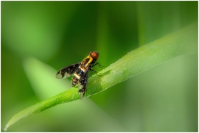Close-up of a colorful fly perched on a green leaf in natural sunlight.