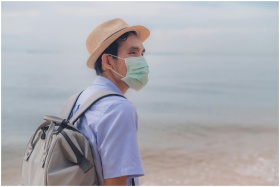 Man wearing a surgical mask and fedora backpacking on a serene beach, embracing the new normal.