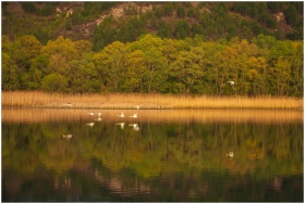 Peaceful lake scene with birds flying and forest reflecting in water.