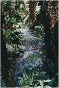 Tranquil stream flowing through a lush, green rainforest with rich vegetation and fern leaves.