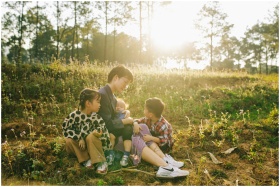 A mother with her three children enjoying a sunny day outdoors in a forest meadow.