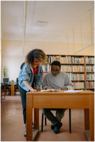 Two university students studying together in a lib