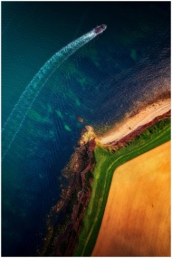 Stunning aerial shot of a boat near Budleigh Salterton coastline in England, showcasing vibrant sea and landscape.