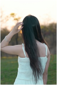 Woman with long dark hair in a white dress enjoying nature during sunset outdoors.