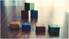 A vibrant still life of wooden alphabet blocks spelling 'PLAY' on a wooden surface.