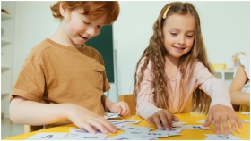 Happy children engaged in learning with educational flashcards in a classroom setting.