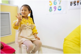 Young girl in a classroom setting learning numbers, showcasing educational activities.
