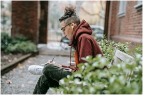 Pensive young man writing in a notebook while seated on an outdoor bench.