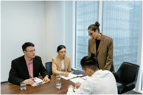 A group of business professionals engaged in a team meeting in a modern office setting.