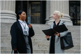 Two professional women in discussion on outdoor courthouse steps, holding documents.
