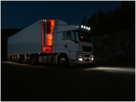 A white truck lit by headlights and interior lights on a dark road in mountainous terrain.