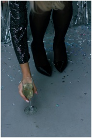Close-up of a woman in black heels picking up a champagne glass amid party confetti.