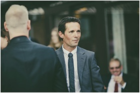 Business professionals in suits attending an outdoor event. Focus on formal attire and networking.