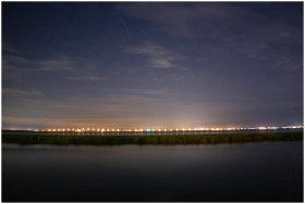 Captivating view of night sky over Wildwood, NJ with city lights reflecting on water.