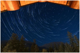 Stunning star trails forming circles above a serene forest view framed by a wooden cabin roof.