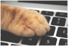 A fluffy orange cat paw rests on a black computer keyboard, symbolizing tech and pets merging.