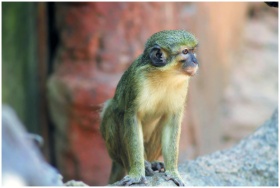 A green monkey sits on a rock in its natural habit