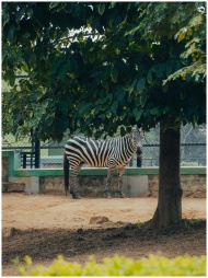 Zebra standing under a tree in a zoo enclosure in Bengaluru, India.