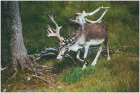 A majestic reindeer with antlers in a lush forest setting, showcasing wildlife in its natural habitat.