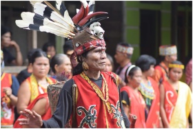 Vibrant celebration of Dayak culture with traditional costumes and rituals in Kalimantan Barat, Indonesia.