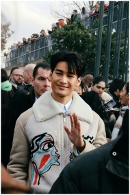 Smiling man among a crowd on a lively Paris street, capturing modern fashion and public event atmosphere.