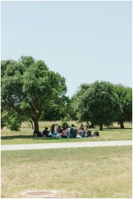 A serene outdoor gathering of adults under trees in a Portuguese park on a sunny day.