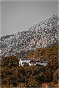 A picturesque house nestled among lush trees at the base of Göynük mountains in Antalya, Türkiye.