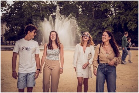 A joyful group of friends walking together near a water fountain in Brussels city park.