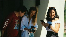 Three young friends smiling, sharing moments with a camera and phone outdoors, enjoying a sunny day.