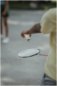 Close-up of a person playing badminton outdoors on